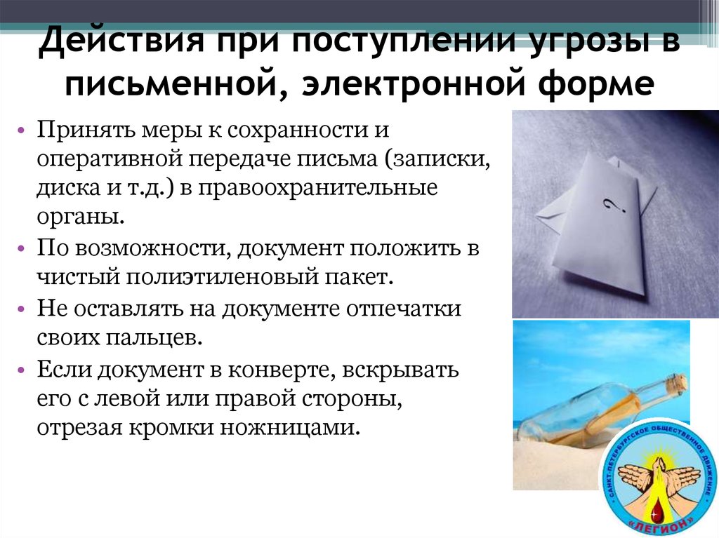 ugroza_terroristicheskogo_akta_v_pismennom_vide.docx Скачать файл. 14.23 КБ ugroza_terroristicheskogo_akta_v_pismennom_vide.docx 260 просмотров Перекрёстные ссылки книги для Действия при поступлении угрозы в письменном виде 07.11.2024г. ‹ Действия при обнаружении предмета, похожего на взрывное устройство 01.11.2024г. Вверх Правила поведения при нахождении в зоне действия железнодорожного транспорта: 17/10/2024г. ›